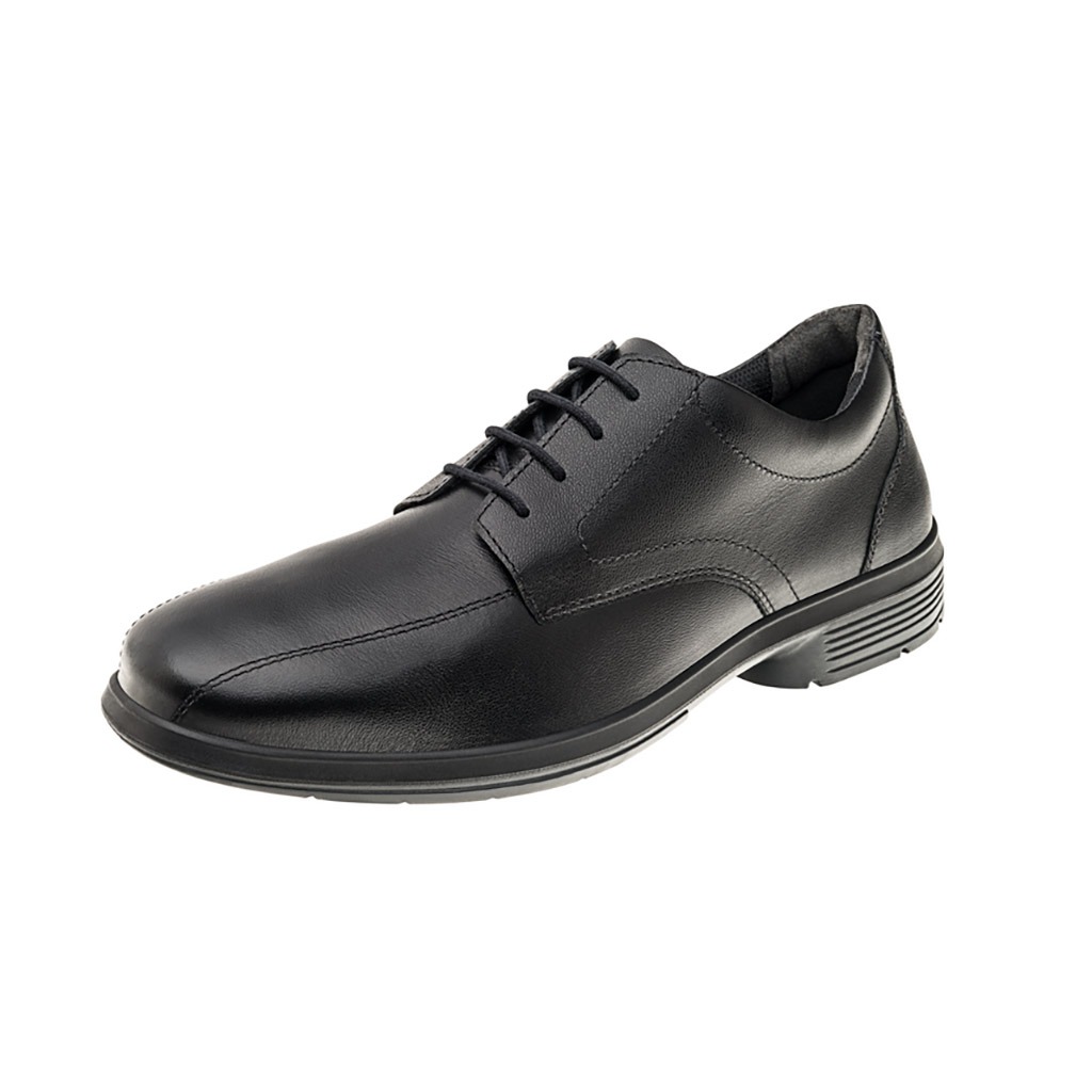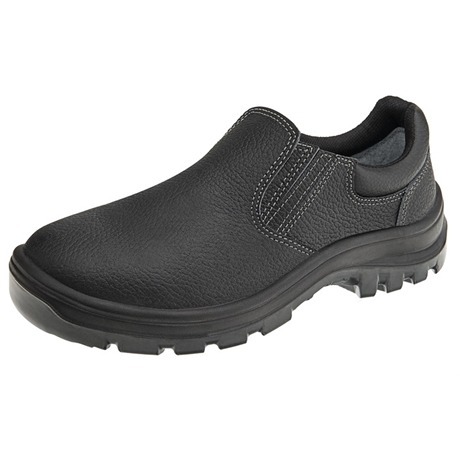 Calçado de segurança, tipo sapato, com fechamento em cadarço, confeccionado em couro curtido ao cromo na cor preta, palmilha de montagem em material sintético antiestático na cor preta, costurada pelo processo strobel, forro interno em material não tecido na cor cinza, solado de poliuretano bidensidade com propriedades antiestáticas, injetado diretamente ao cabedal na cor preta, com biqueira de aço, resistente ao óleo combustível e absorção de energia no calcanhar.