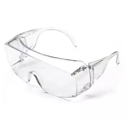 Óculos de segurança, modelo ampla-visão, constituído de armação confeccionada em uma única peça de PVC flexível cinza transparente, com sistema de ventilação indireta, composta de cinco aberturas na parte superior e quatro aberturas de cada lado na parte inferior, tirante elástico utilizado para ajuste à face do usuário preso por meio de presilhas plásticas na extremidade da armação e visor de policarbonato incolor. O óculos cobre toda a região em torno dos olhos do usuário.