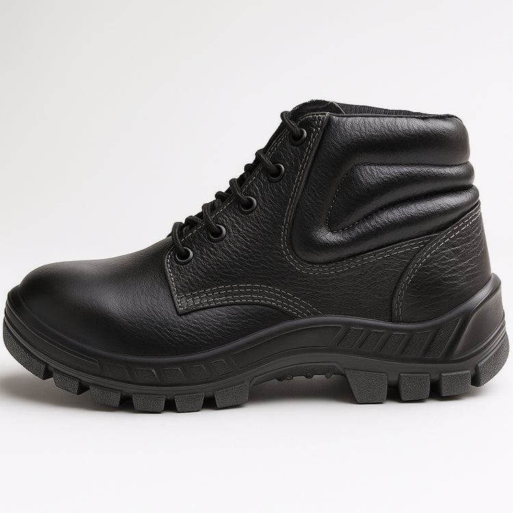 Calçado ocupacional tipo botina, fechamento em cadarço, confeccionado em couro (raspa) curtido ao cromo na cor preta, palmilha de montagem em não tecido, forro da gáspea em não tecido na cor cinza, solado de poliuretano bidensidade na cor cinza injetado diretamente no cabedal, biqueira plástica para conformação, resistente ao óleo combustível, para uso eletricista.