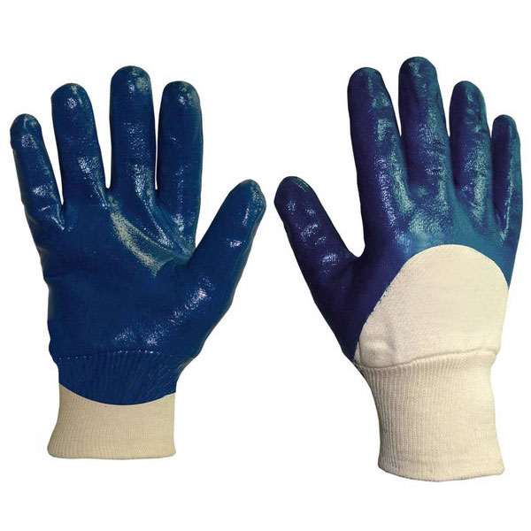Luva de segurança confeccionada em malha de algodão (Suedine), face palmar, dedos, ponta dos dedos e ¾ do dorso com revestimento em borracha nitrílica, com ¼ do dorso (ventilado), acabamento do punho em malha com elástico.