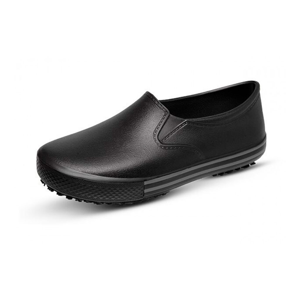 Calçado ocupacional de uso profissional tipo tamanco, confeccionado em EVA, palmilha interna removível em PU (poliuretano), solado de borracha antiderrapante, resistente ao escorregamento em piso cerâmico com solução de detergente e em piso de aço com solução de glicerol, à absorção de energia na região do salto e ao óleo combustível.