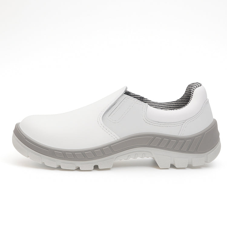 Calçado ocupacional básico (OB), modelo baixo constituída de EVA (Etileno Vinil Acetato), desenho do cabedal tipo "A", montagem sistema injeção por expansão na cor branca, Classificação (II – Inteiro Polimérico), solado de borracha na cor bege sem ressaltos. Região do salto totalmente fechado, com resistência ao scorregamento SRC.