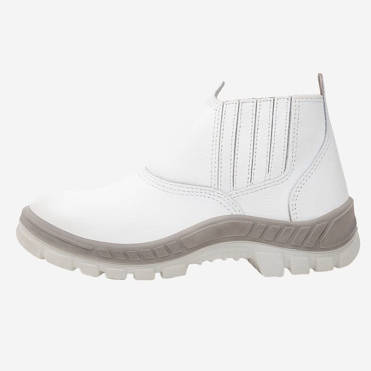 Calçado de segurança de uso profissional tipo bota/botina, fechamento em cadarço, confeccionado em couro curtido ao cromo e material têxtil, ambos resistentes ao corte, forro da gáspea em não tecido, forro lateral em tecido, palmilha de montagem em fibras não metálicas resistentes à perfuração montada pelo sistema strobel, palmilha interna removível, biqueira de composite, solado de poliuretano bidensidade injetado diretamente no cabedal, resistente à absorção de energia na região do salto e ao óleo combustível.