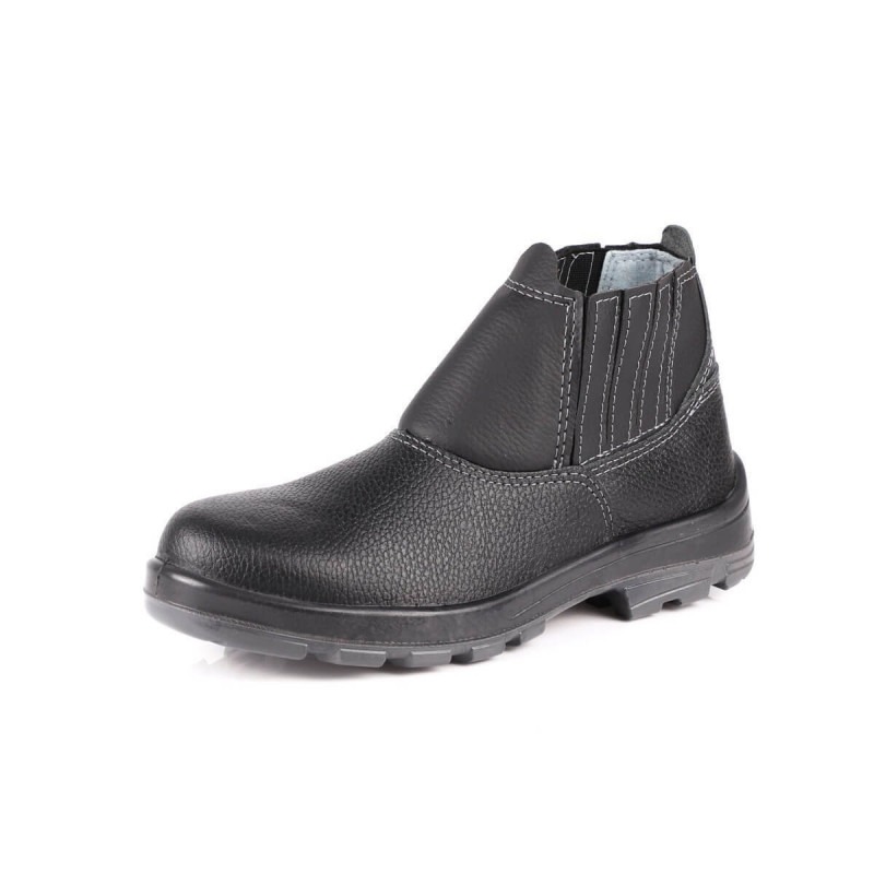 Calçado de segurança isolante elétrico de uso profissional tipo botina, fechamento em cadarço (amarrar), cabedal em couro tipo nobuck, colarinho em material têxtil, forro da gáspea em não tecido, forro lateral em tecido, palmilha de montagem em fibras não metálicas resistentes à perfuração e montada pelo sistema strobel, palmilha interna removível, biqueira de composite, solado de poliuretano bidensidade injetado diretamente no cabedal, resistente ao escorregamento e à absorção de energia na região do salto.