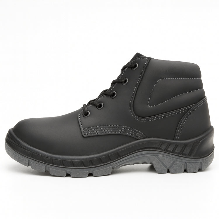 Calçado ocupacional de uso profissional tipo botina, fechamento com fecho de correr, confeccionado em couro, colarinho em material têxtil, forro da gáspea em não tecido, forro lateral em tecido, palmilha de montagem em não tecido fixada pelo sistema strobel, palmilha interna removível, biqueira termoplástica para conformação, solado de borracha colado e blaqueado ao cabedal.