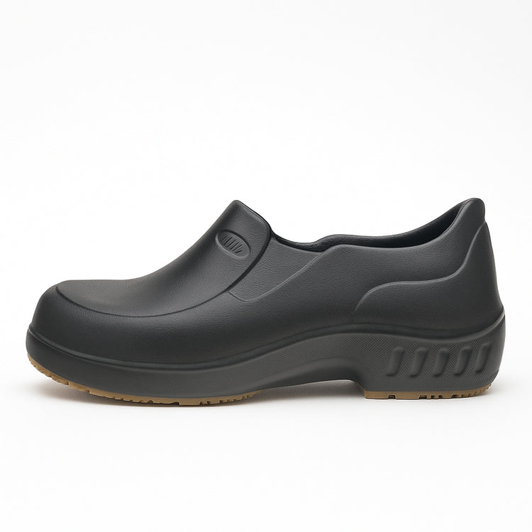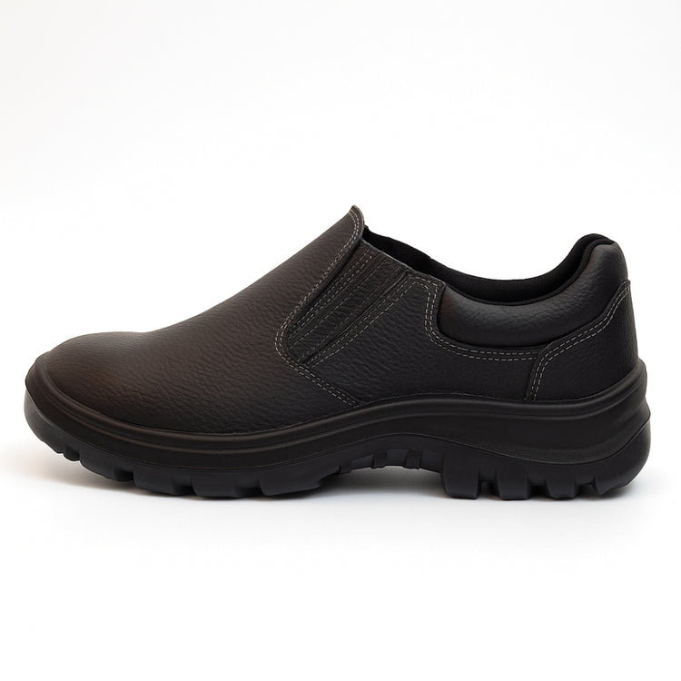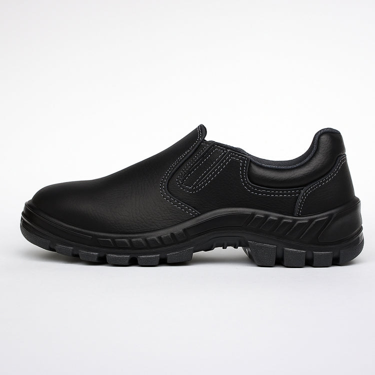 Calçado ocupacional de uso profissional tipo sapato, fechamento em cadarço, confeccionado em couro e material têxtil, forro da gáspea em não tecido, forro lateral em tecido, palmilha de montagem em não tecido fixada pelo sistema strobel, palmilha interna removível, biqueira termoplástica para conformação, solado de borracha colado e blaqueado.