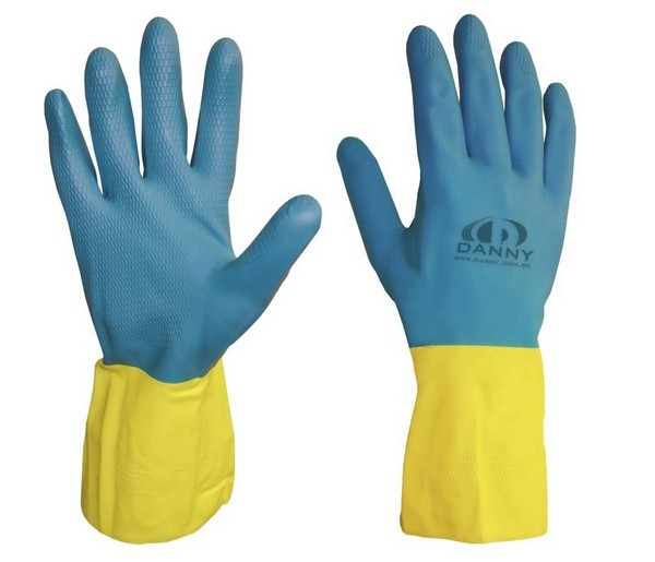 Luva de segurança confeccionada em látex (borracha natural) e policloropreno (neoprene) na palma e dorso, revestimento interno com algodão flocado, palma e dedos antiderrapantes.